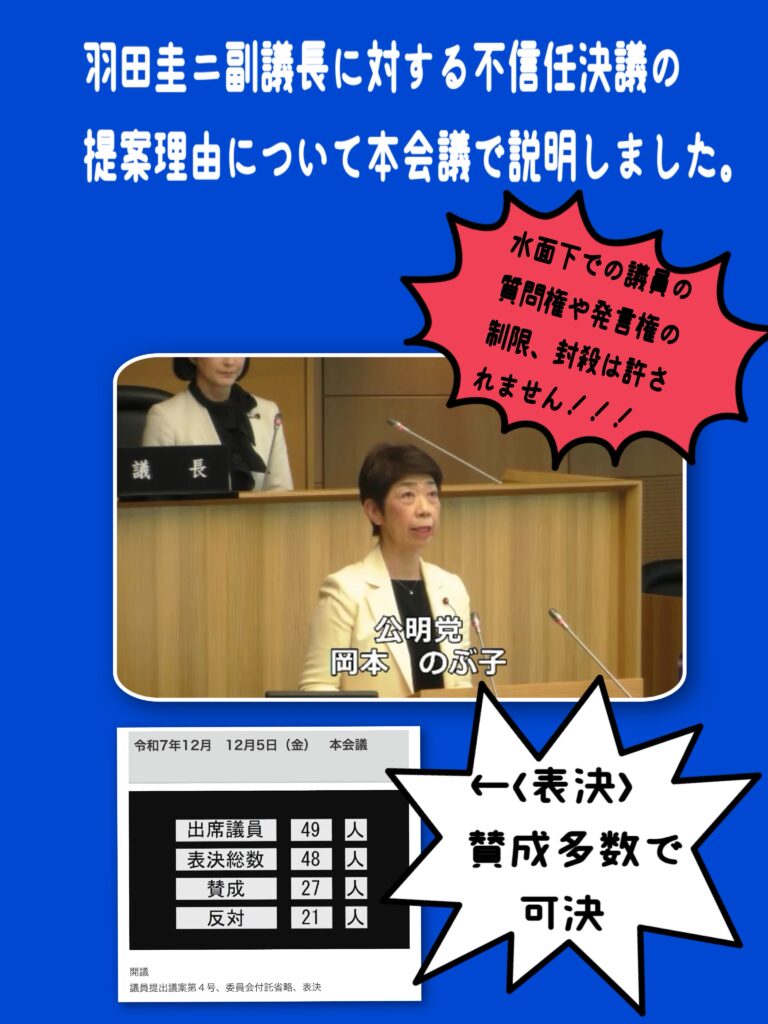 12/5(金)第4回世田谷区議会定例会の閉会日に、羽田圭二副議長(所属会派:立憲民主党•無所属•愛)が、不信任決議が図られ27-21の賛成多数で、可決しました。