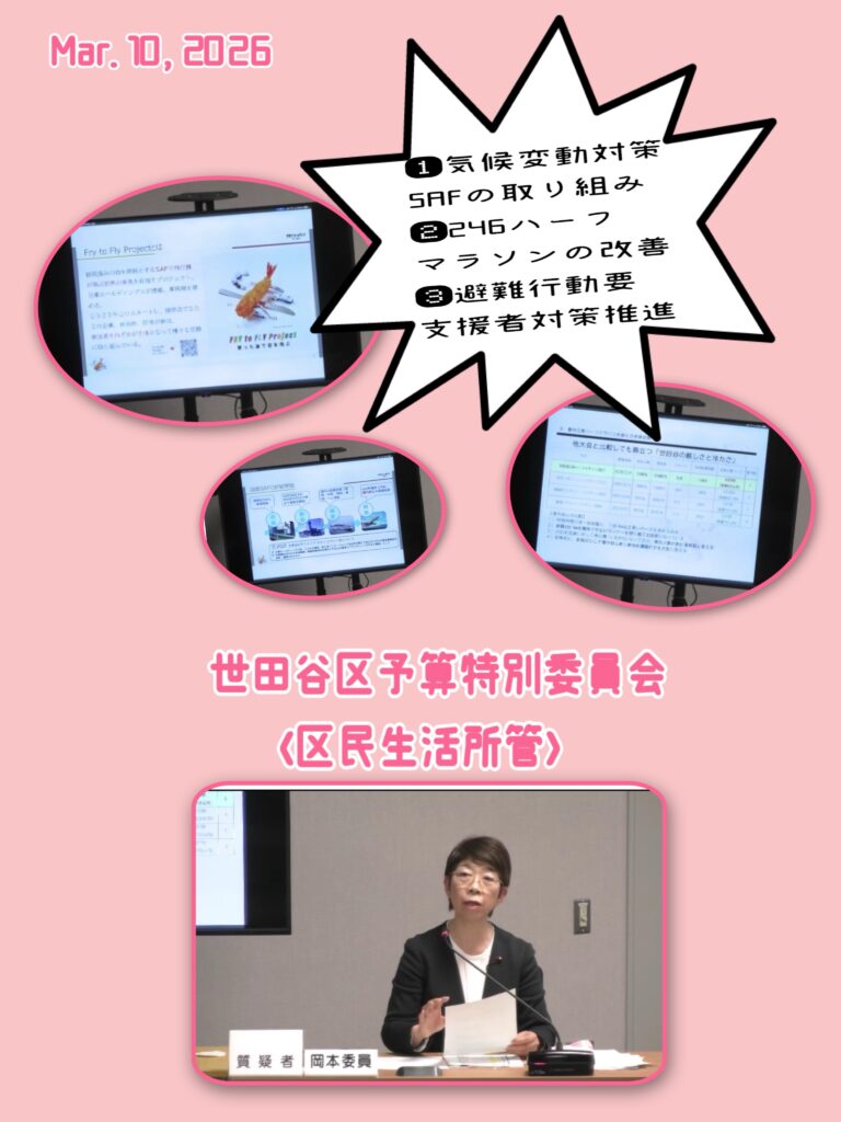 3月10日(火)世田谷区予算特別委員会 区民生活所管で質疑が行われ、公明党区議団より佐藤ひろと委員、津上ひとし委員、岡本のぶ子、高橋あきひこ委員の4名が登壇いたしました。